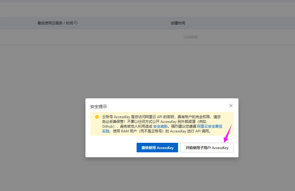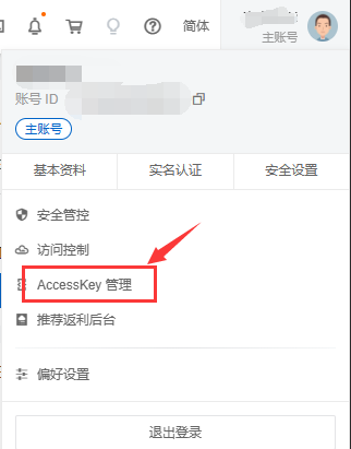 登录控制台,在头像下面进入 “AccessKey管理” 页面。