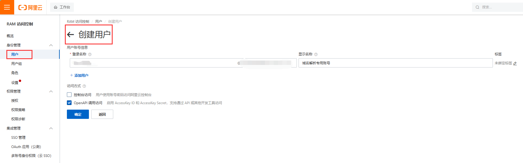 建议在“身份管理-用户-创建用户”中创建一个专用帐号(需要对子帐号设置单独的权限,否则无法正常操作API)