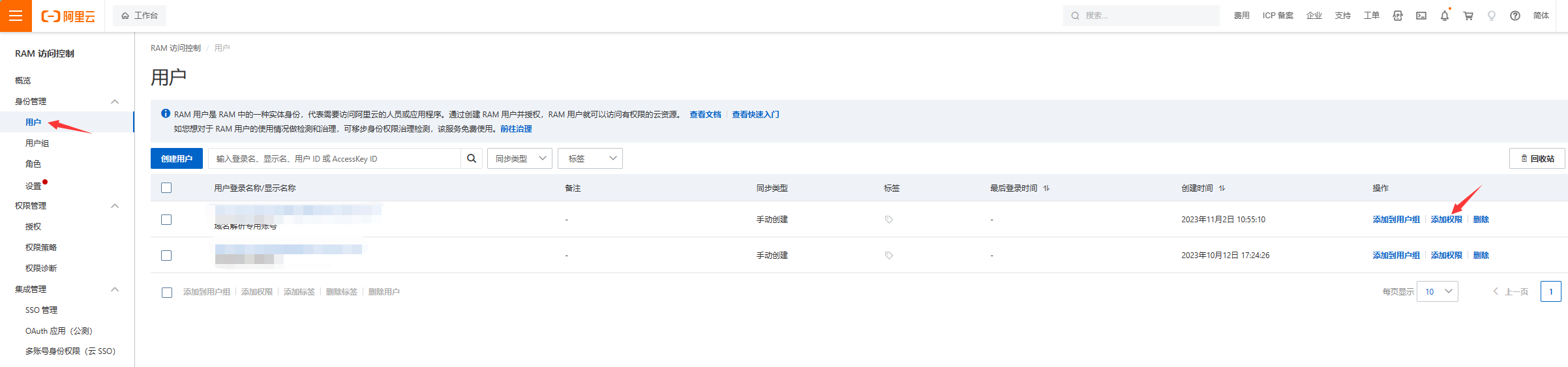 - 返回用户管理页面,选择刚才创建的用户,选择添加权限
